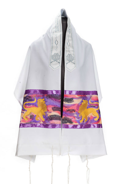 The Purple Lion of Judah Tallit is a men's prayer shawl that carries deep symbolism and significance. The design is inspired by the biblical imagery of Jacob's blessing to his son Judah, referring to the tribe's strength, power, and courage with the metaphor of a lion. The Lion of Judah has been a prominent Jewish symbol for centuries.