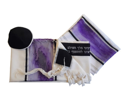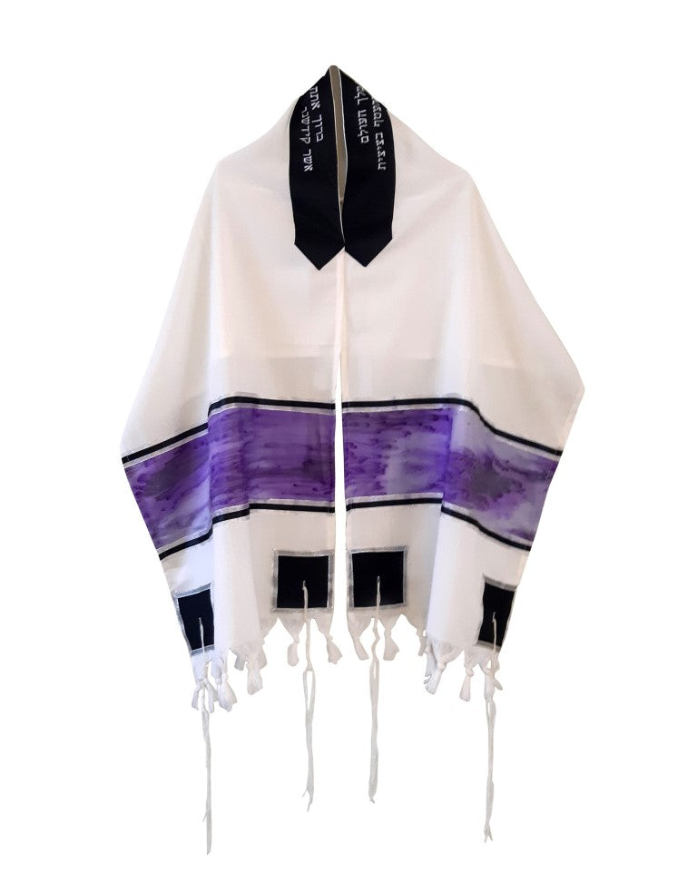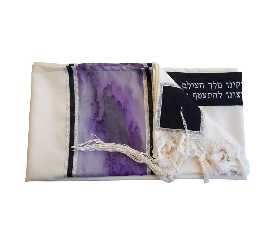 Purple Marble Hand Painted Silk on Wool Tallit, Bar Mitzva Tallit, Tzitzit, Jewish Prayer Shawl set