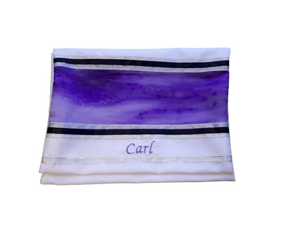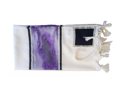 This unique Wool Tallit, Galilee Silks Bar Mitzvah Tallit design has a unique decorative panel made of hand painted silk in Purple, Black and Gray - creating a dramatic yet subtle look.