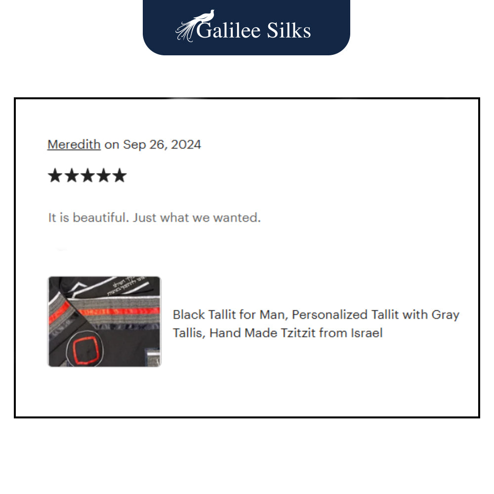 Like other Galilee Silks Bar Mitzvah Tallit Sets, Black Tallit for Men and Wedding Tallit gadol, it is sold as a Tzitzit set with a matching Tallit bag and kippah.