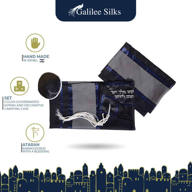 Black Tallit Prayer Shawl with Gray and Blue Stripes, Bar Mitzvah Tallit Set, Men's Tallis Tzitzit