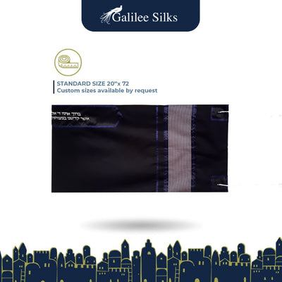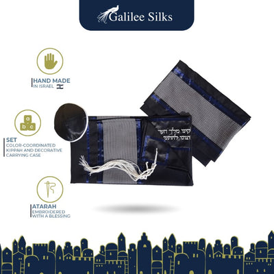 Navy and royal Blue ribbons above and below give a final touch of elegance. This exclusive Tallit is from the new Galilee Collection.