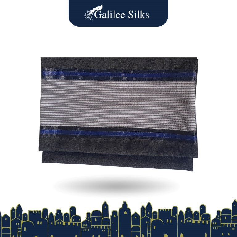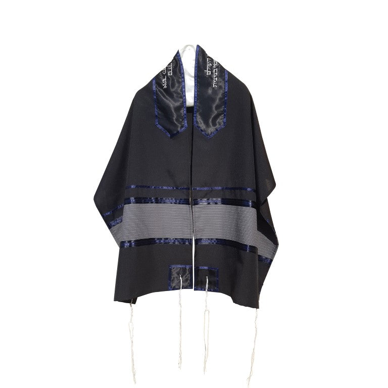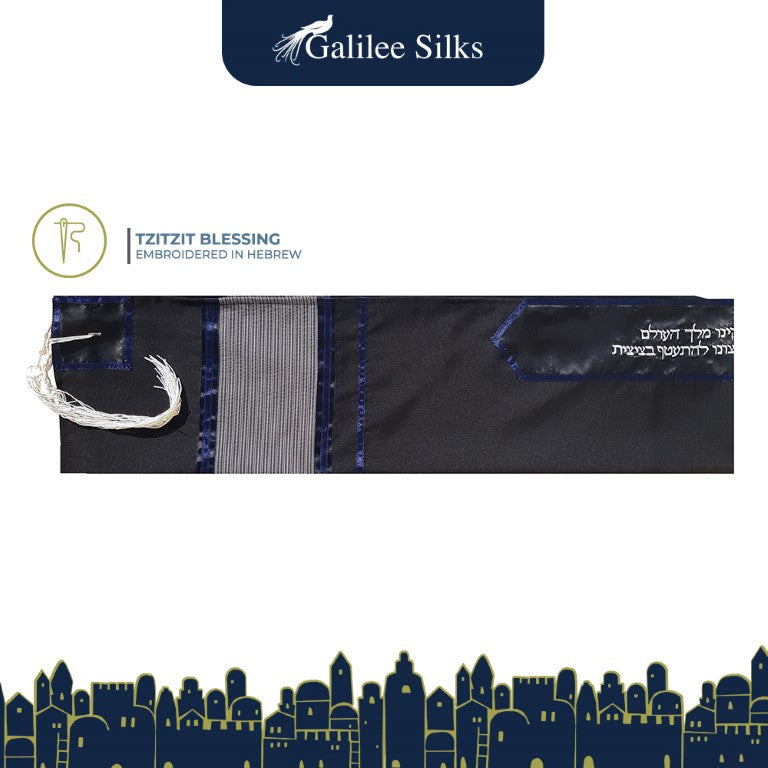The Majestic Royal-Looking Black Tallit, Bar Mitzvah Tallit Set, Modern Tallit is a unique distinguished Black polyester Tallit, enhanced with a tasteful Polyester panel of woven Blue and White stripes.