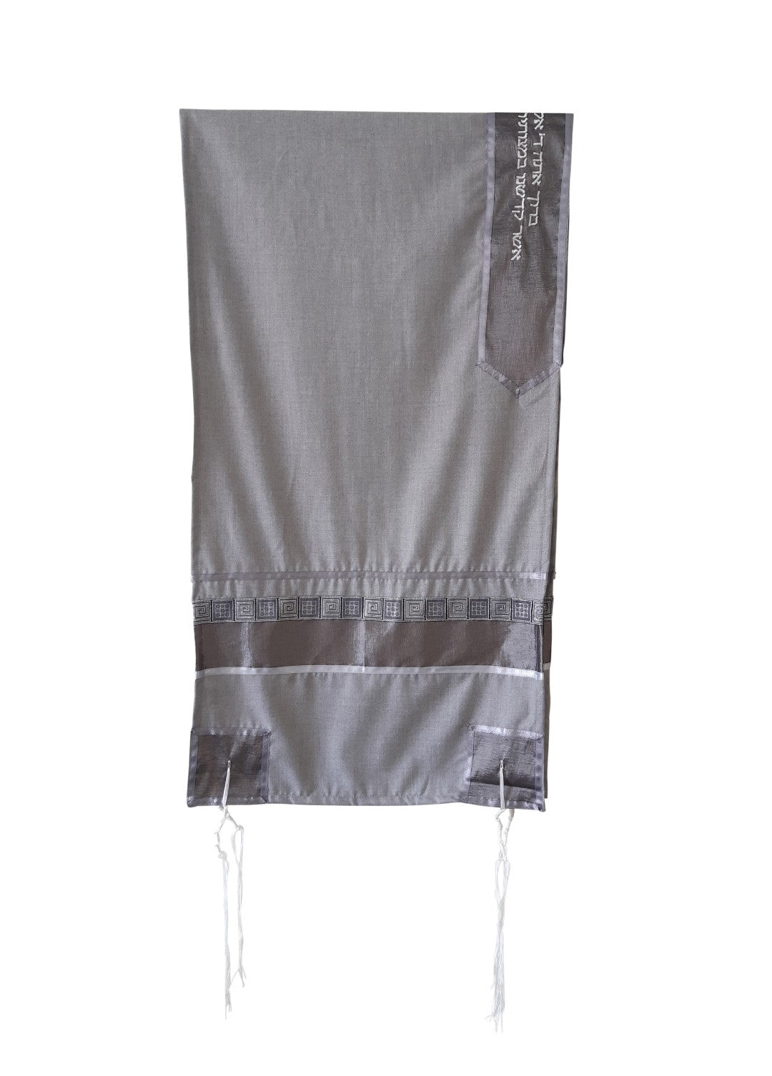 Immerse yourself in a dream-like state of prayer and introspection with the Gray Bar Mitzvah Tallit Set. This modern tallit tzitzit is designed to evoke a sense of tranquility and focus. A wide gray panel adorned with a silver stripe serves as the centerpiece, while above it, a shades-of-gray stripe with a harmonious geometric square design adds an element of elegance. This tallit exudes rare dignity and distinction, making it a meaningful gift for your loved one.
