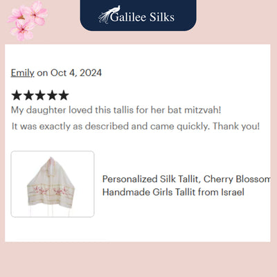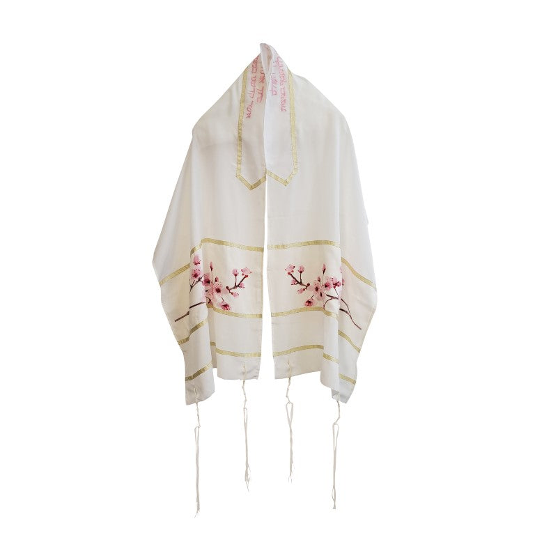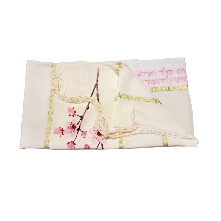 Embrace the beauty of nature with the Cherry Blossom Tallit for Woman, Girl Tallit, and Bat Mitzvah Tallit. This exquisite silk tallis features a printed cherry blossom branch design, capturing the essence of elegance and femininity. Made from 100% Crepe de chine Silk, this talit offers a luxurious and delicate feel.