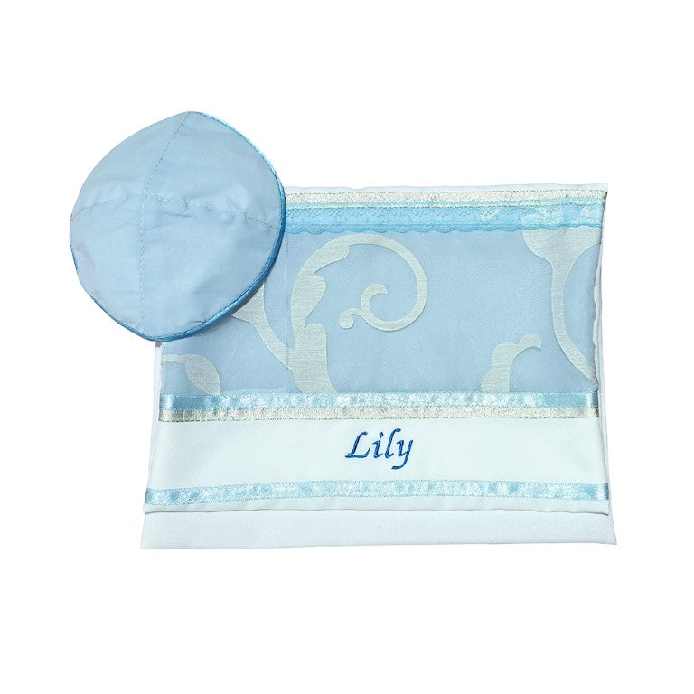 The design pattern of this bat mitzvah tallit is repeated on the Tallit bag. The kippah has a matching color.