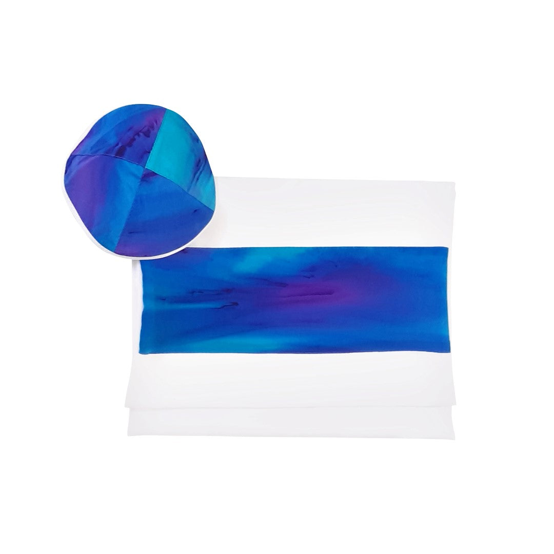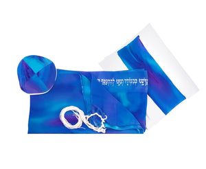 Hand Painted Blue Shades with Turquoise and Purple Silk Tallit set for Women, Bat Mitzvah Tallit, Girl&