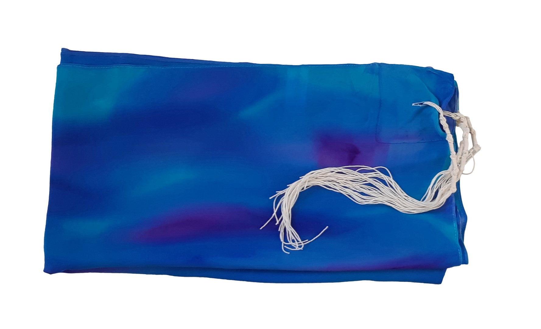 The Hand Painted Blue, Turquoise, and Purple Shades Silk Tallit for Women is a unique and stunning creation in aqua colors. Made of silk crepe de chine, it combines beautiful shades of blue with hints of turquoise and purple. The tallit is soft, lightweight, and comfortable to wear.