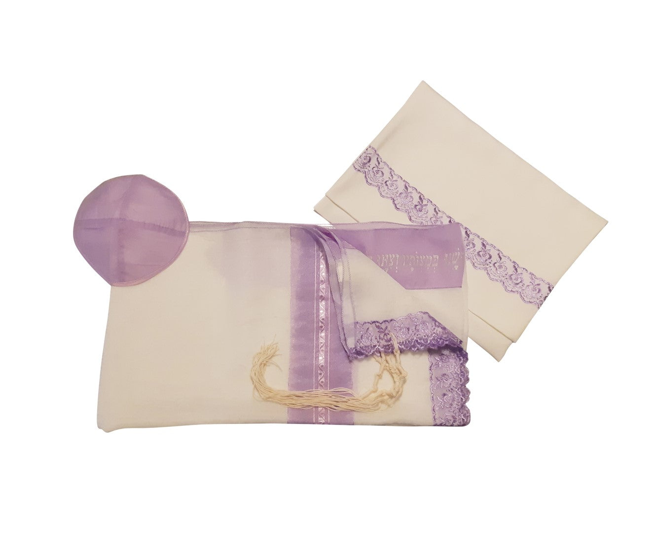 The tallit is made of sheer polyester, with a Lilac colored edge along the tallit that adds to this interesting feminine design.