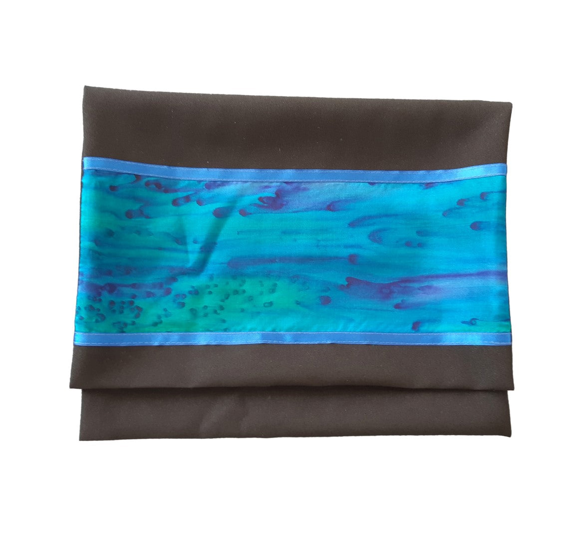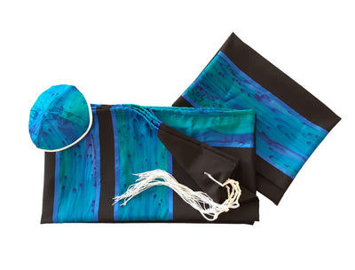 This NEW Tallit Tzitzit design is vibrant and original with unique hand painted silk stripes in Turquoise and Blue blend.