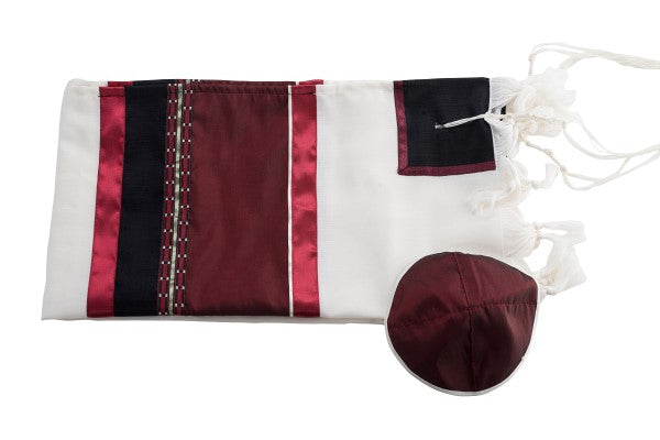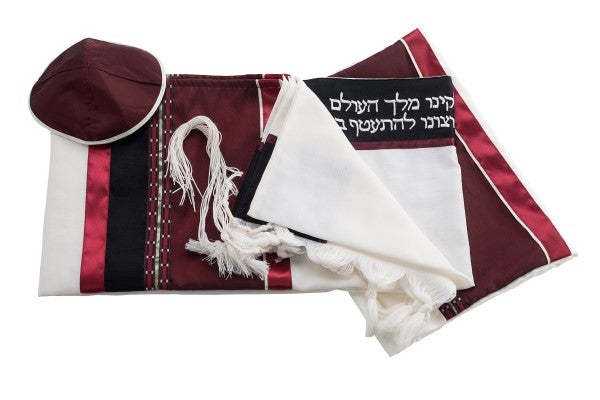 This is a particularly distinguished tallit for life's special occasions and Shabbat and a Bar Mitzvah Tallit . Decorated with dark Red Satin stripes.The base fabric of the tallit can be 100% wool or Vegan Polyester.