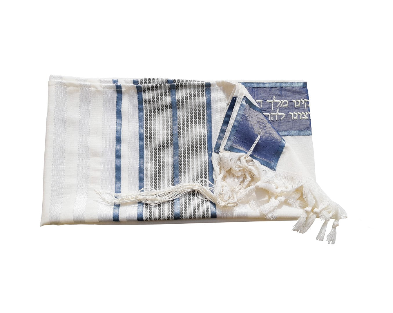 Elegantly displayed on a decorative panel are powder blue ribbons alongside narrow sky-blue and white stripes. Blue, forever associated with the techeilet tzitzit thread, has always been a Jewish color – a reminder to each person to include spirituality in daily living.The Tallit blessing is embroidered on the atarah.