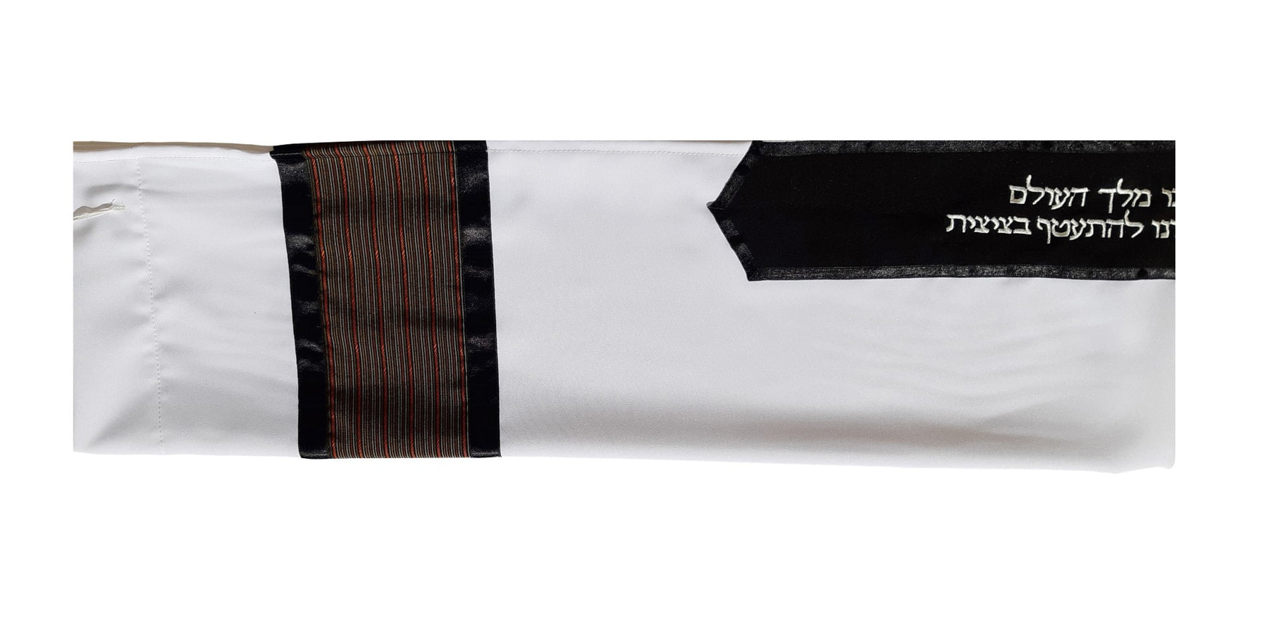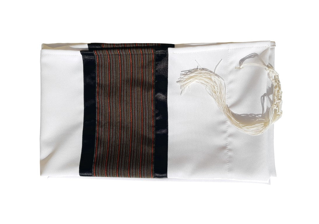 Distinguished Black, Brown and Red Stripes Decorated Tallit with a unique combination of Black Satin ribbons and Taffeta Atarah.