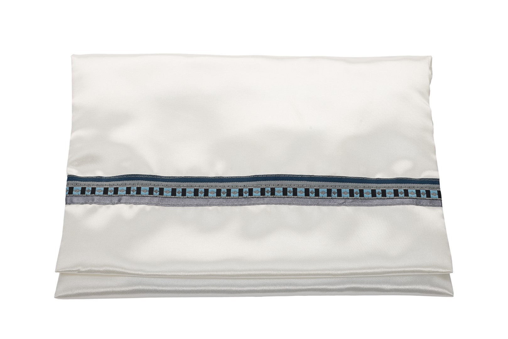 The Tallis blessing is embroidered on atara in Hebrew. The Design is repeated on atara and tzitzit corners. Comes with matching kippah and Tallit bag.