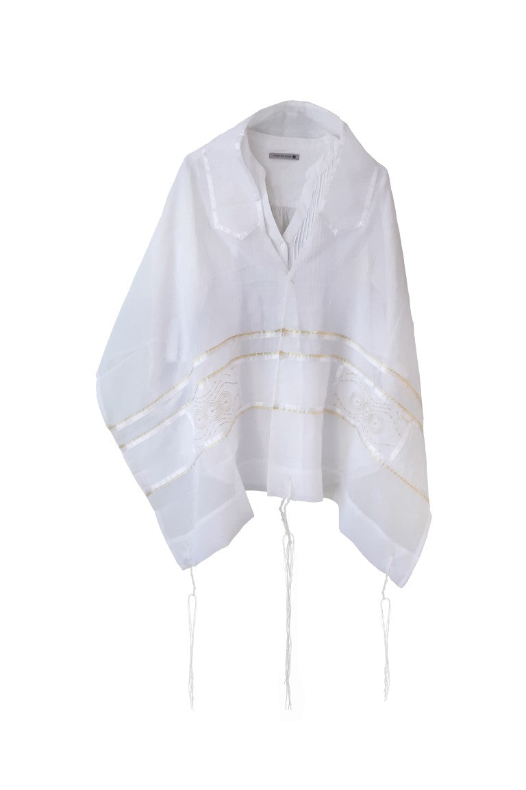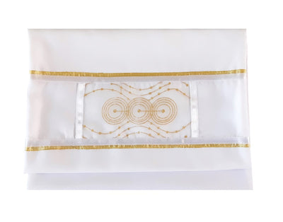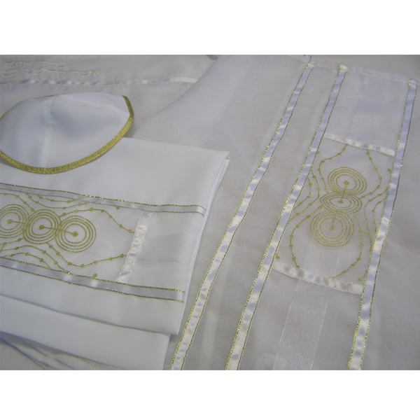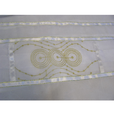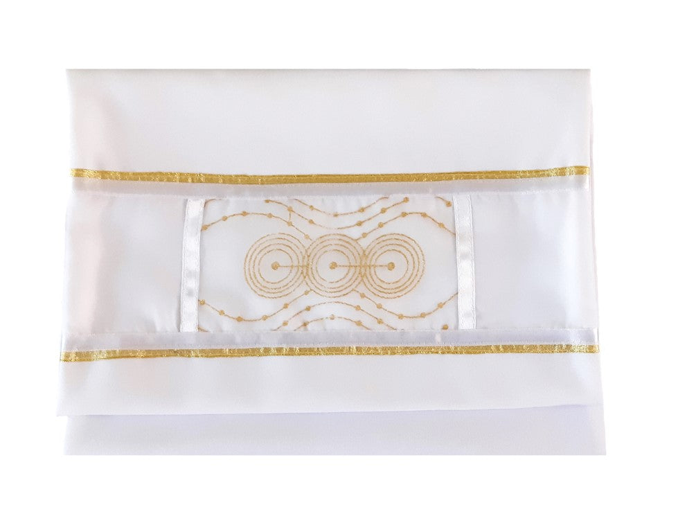 The decoration on this soft, white, sheer polyester Gold Circles feminine Tallit is a wide ribbon that features alternating blocks of white ribbons and a golden circles design.