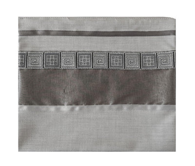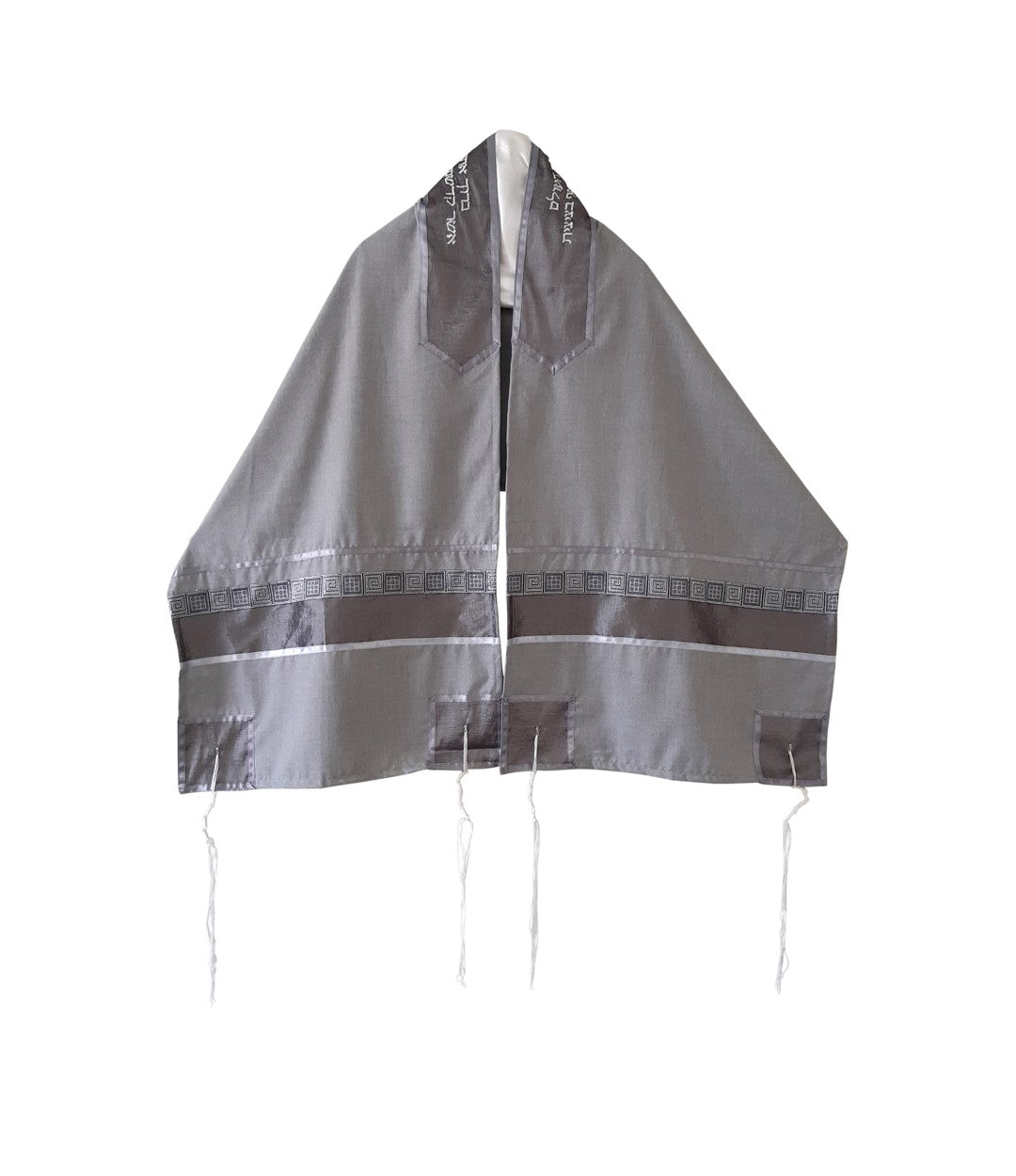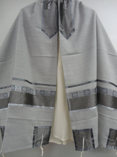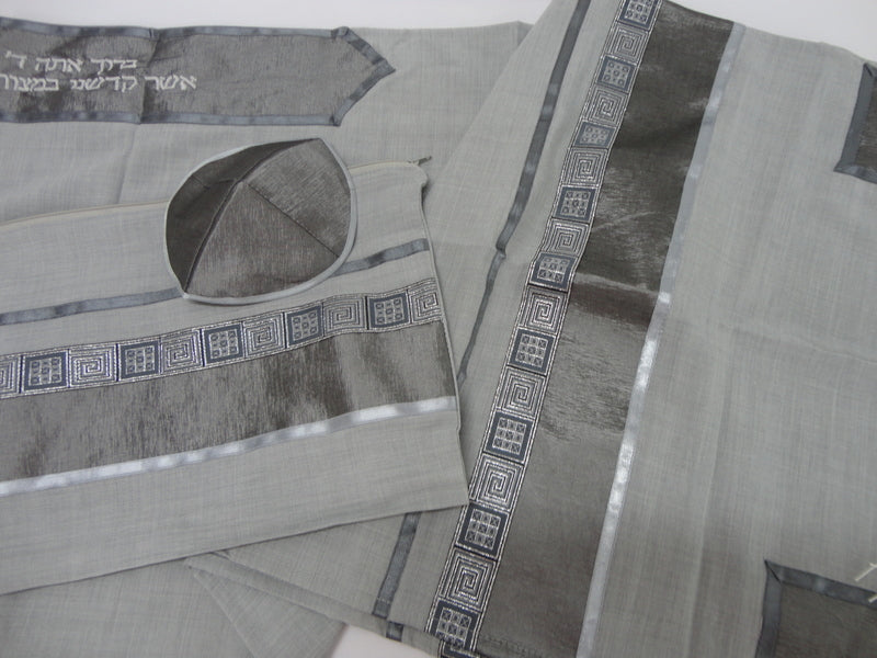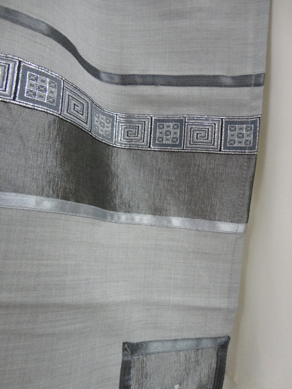 The Light Gray Tallit features a unique design with a base made of a light gray viscose and wool blend. It is adorned with gray fabric panels and gray satin ribbons, adding to its modern and elegant look. The design is repeated on the atara and tzitzit (fringes) corners. It comes with a matching kippah and tallit bag.