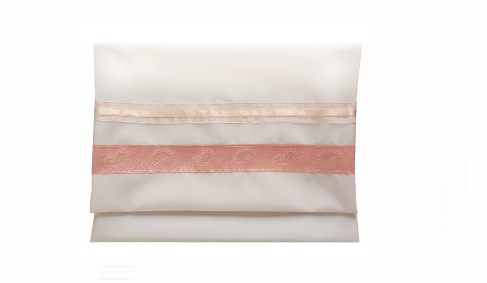 It captures the essence of a feminine tallit and a fashion statement that allows its wearer to fulfill the choice to wear a tallit while being unique and feeling connected and special! It is perfect as a Bat Mitzvah tallit, women's tallit for the Bat Mitzvah mom or grandmother, with its light base and shining Paisley panel. This girls tallit is decorated with complimentary satin ribbons in Pink.