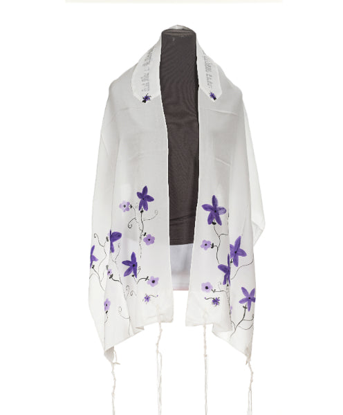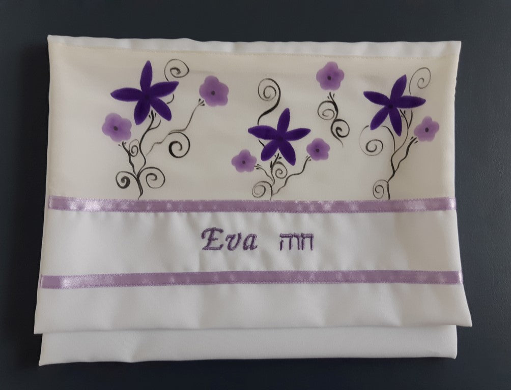 The Purple flowers Silk Tallit for girl, Bat Mitzvah Tallit, Women's Tallit is a delicate hand painted silk prayer shawl.